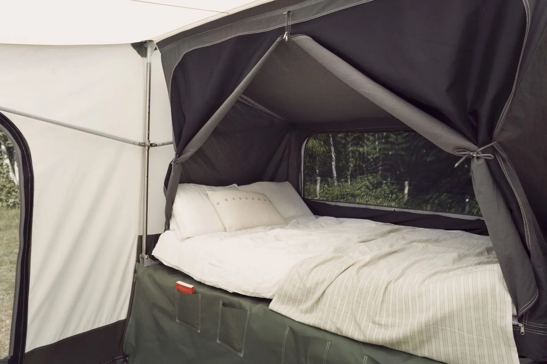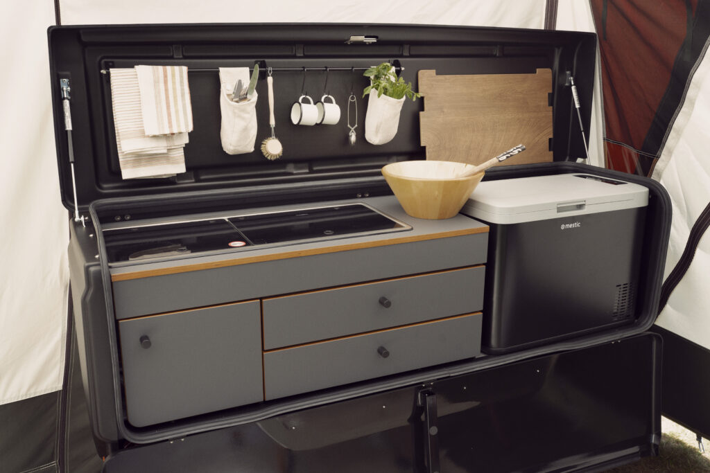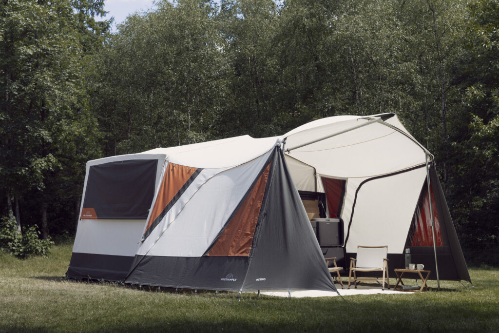 Une tente remorque pour 2 à 5 personne avec cuisine intégrée et un fond en dure. Possibilité de fixé un support pour 6 vélos.
